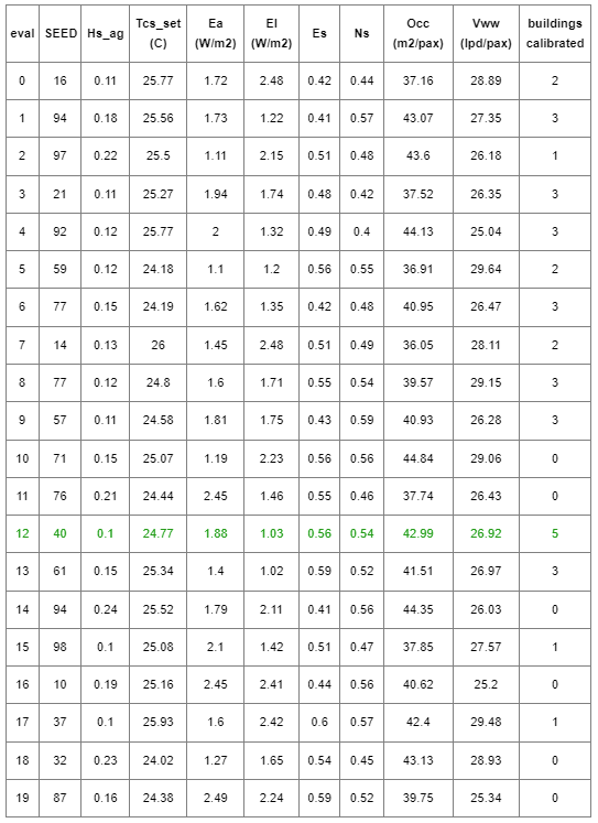 To test the calibration script, we have analysed the same 10 residential buildings in Singapore, aiming to increase their accuracy. The results of the calibration script can be obtained in the project folder and are indicated here (green indicates the best fit found during those iterations):